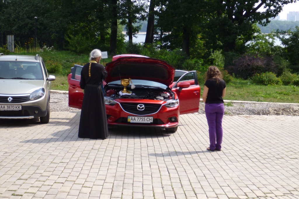 Da es in Kiew sehr viel zu sehen und zu erleben gibt, hatten wir uns gestern entschlossen einen Tag zu verlängern und dafür Lviv zu streichen. Den Tag begangen wir sehr geistlich, mit dem Höhlenkloster. Ausstieg an der Metrohaltestelle Dnipr und das Ufer rauf. 10.00 Uhr und schon brennt die Sonne. Vor dem Klostertor die erste Weihe, die eines neuen Autos.