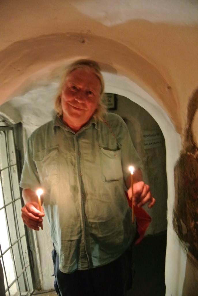 Rein in die erste heilige Höhle. Enger Gang, sehr niedrige Höhe und reichliche kleine Buchten beidseitig des Ganges mit Resten von Heiligen, oder so. Am Eingang wurden Kerzen verkauft. Wir dachten für die üblichen Danksagungen der Gläubigen. Denkste, nicht nur. Die hatten eine Doppelfunktion, die sollten einen auch den Weg in den Höhlen erleuchten, nicht nur den Geist. Nachdem wir mehrmals stockfinster durch die Gänge stolperten und nur an einigen HeiIigensärgen „erleuchtet“ wurden, liehen wir uns (jeder eine) von einem herumstehenden Leuchter kurzer Hand welche aus. Am letzten Leuchter vor dem Ausgang „stifteten“ wir die Kerzen wieder den Heiligen.