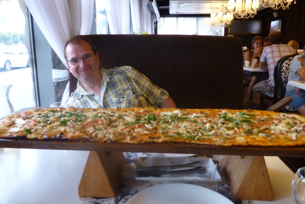 In der Früh machten uns die sehr freundlichen jungen Damen von der Rezeption auf ein heutiges Spezielloffers bei der „Mafia“ aufmerksam. Nein, kein Sonderangebot für Auftragsmorde. Naja, der eine oder andere fiel uns schon ein. Jedenfalls gab’s dort einen halben Liter Wein und einen Meter Pizza für weniger als die Hälfte, wie sonst regulär. Für 79,- Griwna (179,-Griwna), rund 8 €.