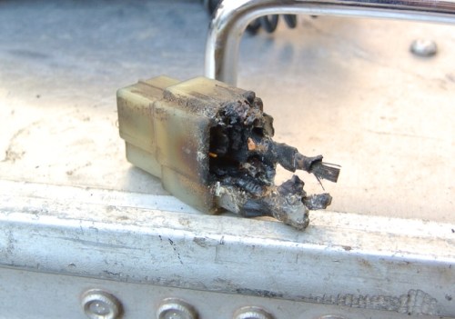 Nach dem Zusammenpacken (irgendwie wird es immer mehr???) haben wir uns mit einer Schachtel Pralinen vom Überaus freundlichen Hotelpersonal verabschiedet. Dann begann die Bastelstunde – nach Vorhersage sollte es regnen, Tat es aber nicht. Wir Bauten Ulis alte Batterie in Maiks Moped, um sie zu laden, aber es stellte sich heraus, die ist tot. Also wieder abgebaut. Dann zu Ulis oller Kiste. Mit der neuen kleinen Batterie zeigte das Messgerät 17 Volt, das kann nicht gut sein. Wir suchen und finden einen völlig verschmorten Stecker zwischen Lima und Regler. Auch das kann nicht gut sein.