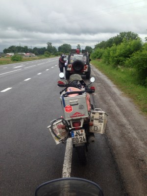 Der Stecker wird herausgeschnitten und überbrückt, aber Voltmeter zeigt keine Veränderung. Es sieht so aus, als würde der Regler nicht mehr regeln und allen Strom ins System blasen, da spinnt die Elektronik und die Batterie kocht, und so ist wohl auch die alte verstorben. Also wird der Stecker des Reglers ausgesteckt und wir fahren auf Batterie los, so was geht locker über hundert Kilometer. Als das Voltmeter Schwäche der Batterie anzeigt, wird der Regler wieder für einige Kilometer angeschlossen, bis die Batterie wieder erstarkt ist. So gelangen ohne Probleme, die letzte Stunde im Regen, in das Provinznest Rivne, unser geplantes Etappenziel. Wir sind jetzt auf dem Heimweg, keine weiteren Sightseeing-Stops sind geplant, Dienstag wollen wir abends im Café Express aufschlagen und unsere glückliche Rückkehr aus dem bösen, gefährlichen Osten feiern, hoffentlich klappt das mit der Batterie.