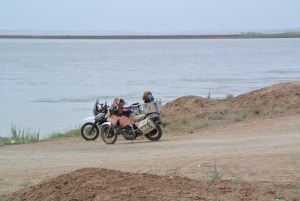 Uli würde sich am liebsten wegen seiner Vergesslichkeit selbst in der Arsch beißen, ist aber nicht gelenkig genug, und Maik weigert sich. Die Straße ist zunächst „normal“, wie üblich meist 1,5 Stunden, In der Zeit schaffen wir ca. 100 km, dann eine kurze Pause und die nächsten 100 km bis Tankpause. Unterwegs eine längere Baustelle mit festem und losem Sand erinnert ein wenig an eine mittelschwere Wüstenpiste, nur kürzer. Nach rund der Hälfte der Strecke kommen wir an eine Fähre über einen Seitenarm der Wolga, schätzungsweise 2 km breit. Wir müssen wie bei der letzten Fähre 2 Std. warten.