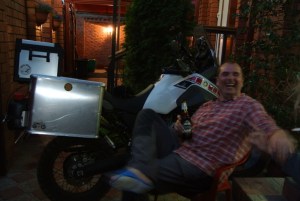Nach kurzer Siesta haben wir unsere Motorräder in Angriff genommen. Heißt, Kontrolle der Kettenspannung und Kettenschmierung. Schon stand ein russischer Motorradfahrer (Sergejj) an Ulis Honda, denn er fährt das selbe Modell. Da beide englisch sprechen, geht das fachsimpeln gleich los.