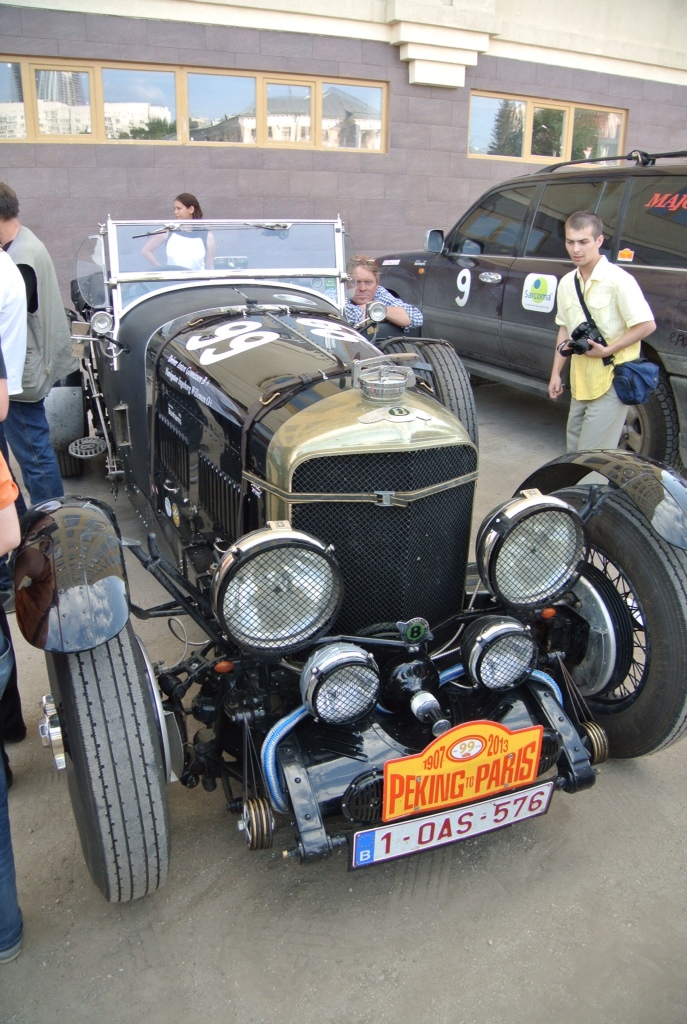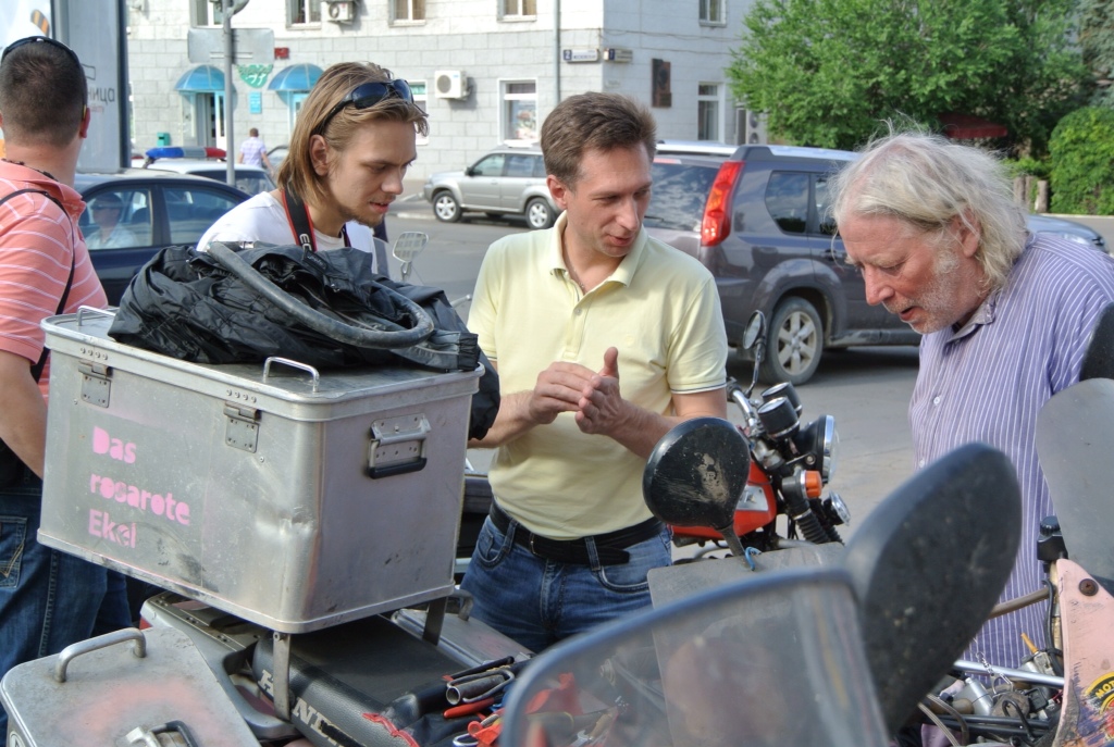 Maik versucht in der Zwischenzeit seine Kettenspannung zu regulieren. CDas klappte erst mal nicht, weil Uli, der Trottel, in einem Anfall geistiger Umnachtung den Knarrenkasten vergessen hat! Also begann bei den mittlerweile sich angesammelten russischen Motorradfahrern eine solidarische Hektik der Hilfe zu entwickeln. Uli besorgte der weil das passende Werkzeug, in dem Moment kam ein Helfer mit einem Gedore-Kasten mit passender Nuss. Denn vor unserer гостиница волна traf die Rallye „Peking to Paris 2013“ gerade ein, also die ersten Fahrzeuge.