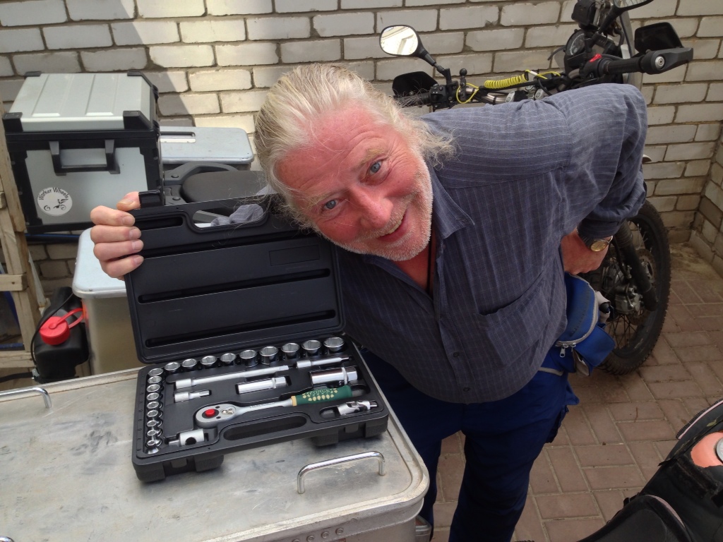 Nach kurzer Siesta haben wir unsere Motorräder in Angriff genommen. Heißt, Kontrolle der Kettenspannung und Kettenschmierung. Schon stand ein russischer Motorradfahrer (Sergejj) an Ulis Honda, denn er fährt das selbe Modell. Da beide englisch sprechen, geht das fachsimpeln gleich los.
