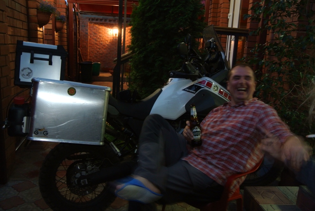 Wir sind jetzt mehr als die Hälfte der Strecke gefahren, über 5000 km, haben ungefähr die Hälfte der geplanten Zeit verbracht, ohne das es Uli gelungen ist, Maik zu einem handfesten Streit zu provozieren, der sagt, dass ist doch kein Gegner, den sich zu töten lohnt. Es liegen noch einige ungewisse Strecken vor uns, nahe Dagestan, Tschetschenien, durch den Nordkaukasus, aber jede Etappe bringt uns etwas näher an unseren Startpunkt Nürnberg. Also ist die Hälfte rum, zur Feier des Tages macht Uli Maik besoffen, und kommt selbst auch nicht zu kurz. Es hat so viel Spaß gemacht, es kann kaum besser werden, höchstens schlechter. Deshalb trauern wir mit Wodka.